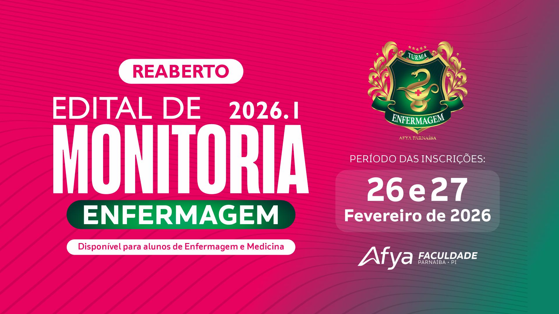A Coordenação do Curso de Enfermagem e da Pós-graduação, Pesquisa, Extensão, Inovação e internacionalização (CoPPExI), Afya Faculdade Parnaíba, no uso de suas atribuições, faz saber que no período de 26 e 27 de fevereiro de 2026, ANEXO - I, estarão reabertas as inscrições para exame de seleção do Programa de Monitoria de Graduação, conforme modalidades e vagas estipuladas neste Edital.