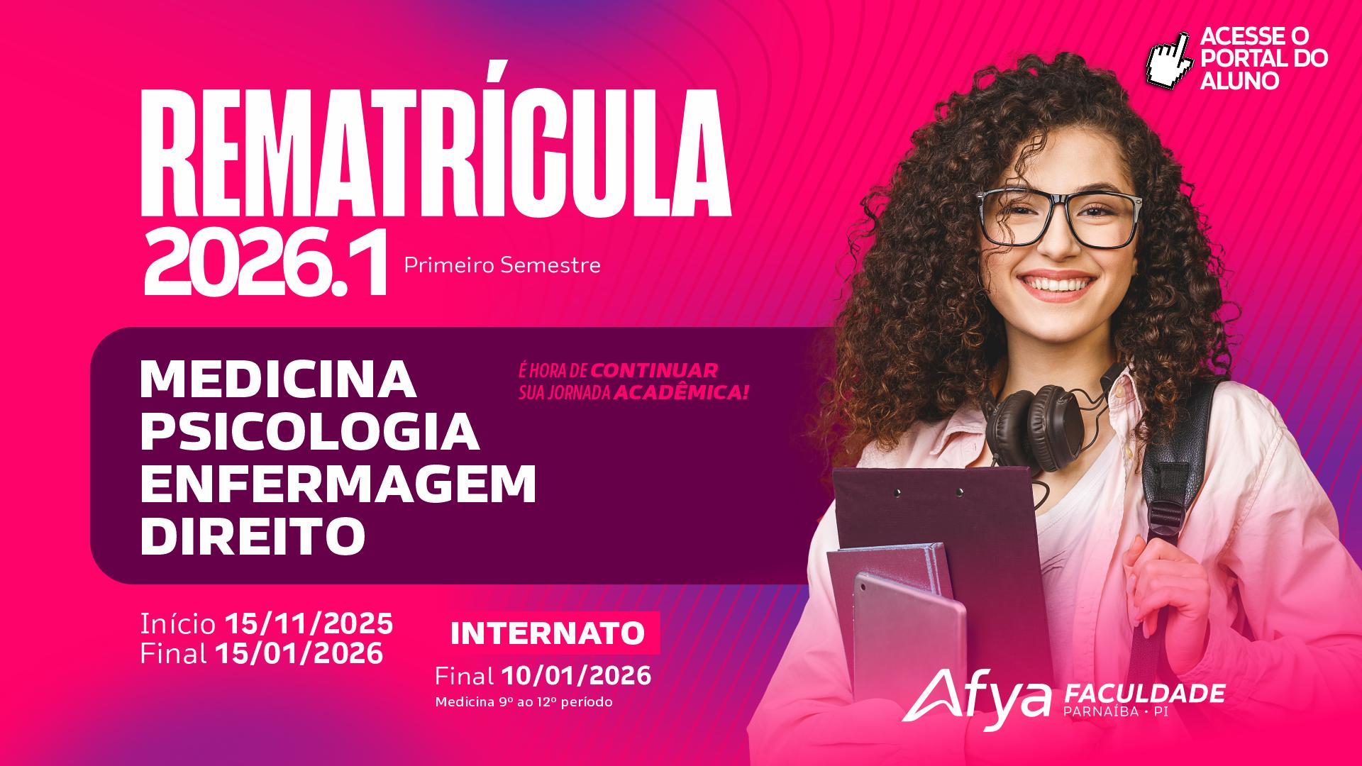 A Diretoria do AFYA – Faculdade de Parnaíba, situada à R. Evandro Lins e Silva, nº 4435 - Sabiazal | Parnaíba - PI | 64212-790, Parnaíba-PI, no uso de suas atribuições legais, divulga por meio deste Edital as condições, prazos e procedimentos para o Processo de Renovação de Matrículas (Veteranos) para o Primeiro Semestre de 2026 dos cursos do MEDICINA, DIREITO, PSICOLOGIA E ENFERMAGEM.