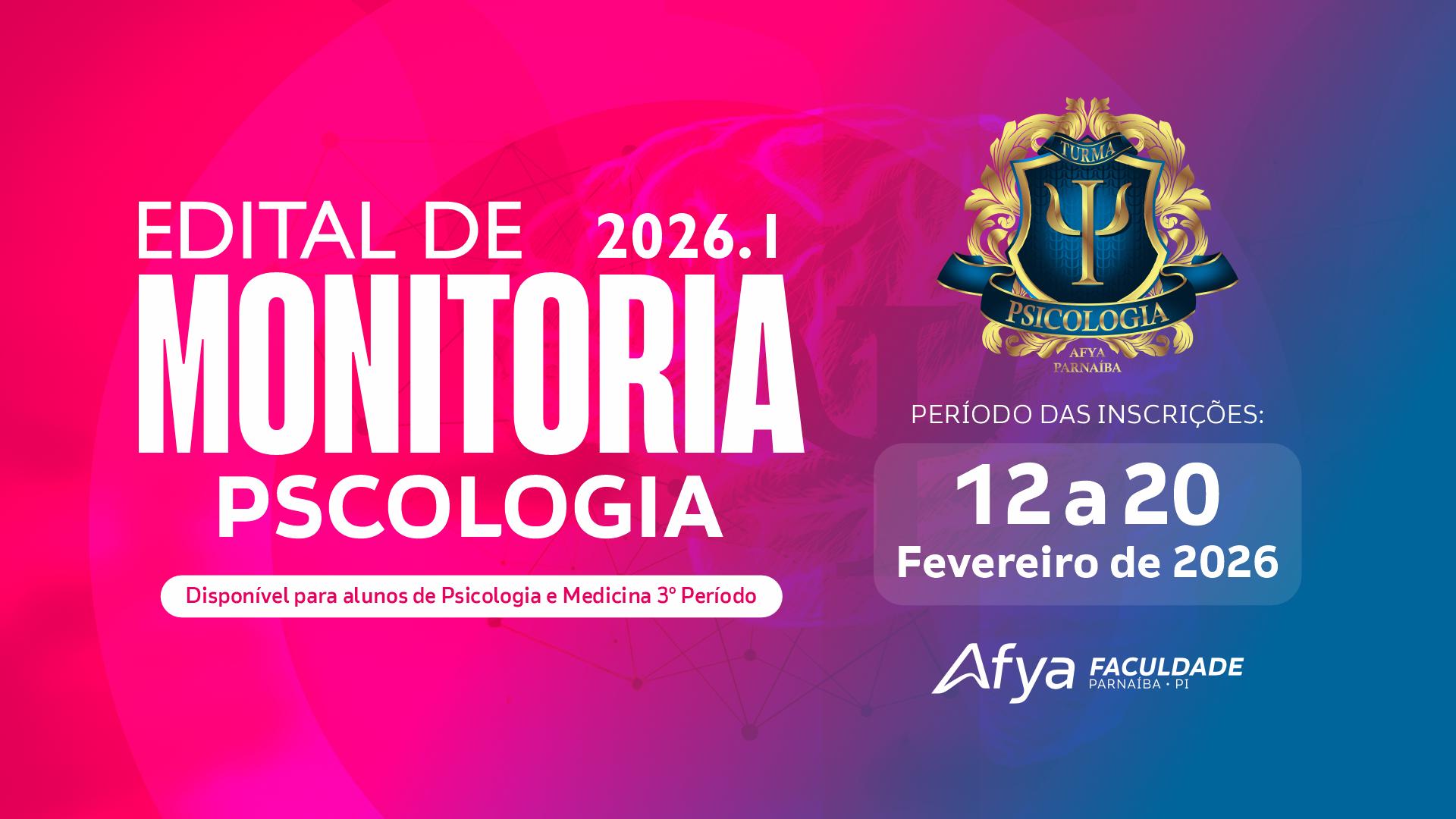 A Coordenação do Curso de Psicologia e da Pós-graduação, Pesquisa, Extensão, Inovação e internacionalização (CoPPExI), da Afya Faculdade Parnaíba, no uso de suas atribuições, faz saber que no período de 12 a 20 de fevereiro de 2026, ANEXO - I, estarão abertas as inscrições para exame de seleção do Programa de Monitoria de Graduação, conforme modalidades e vagas estipuladas neste Edital.