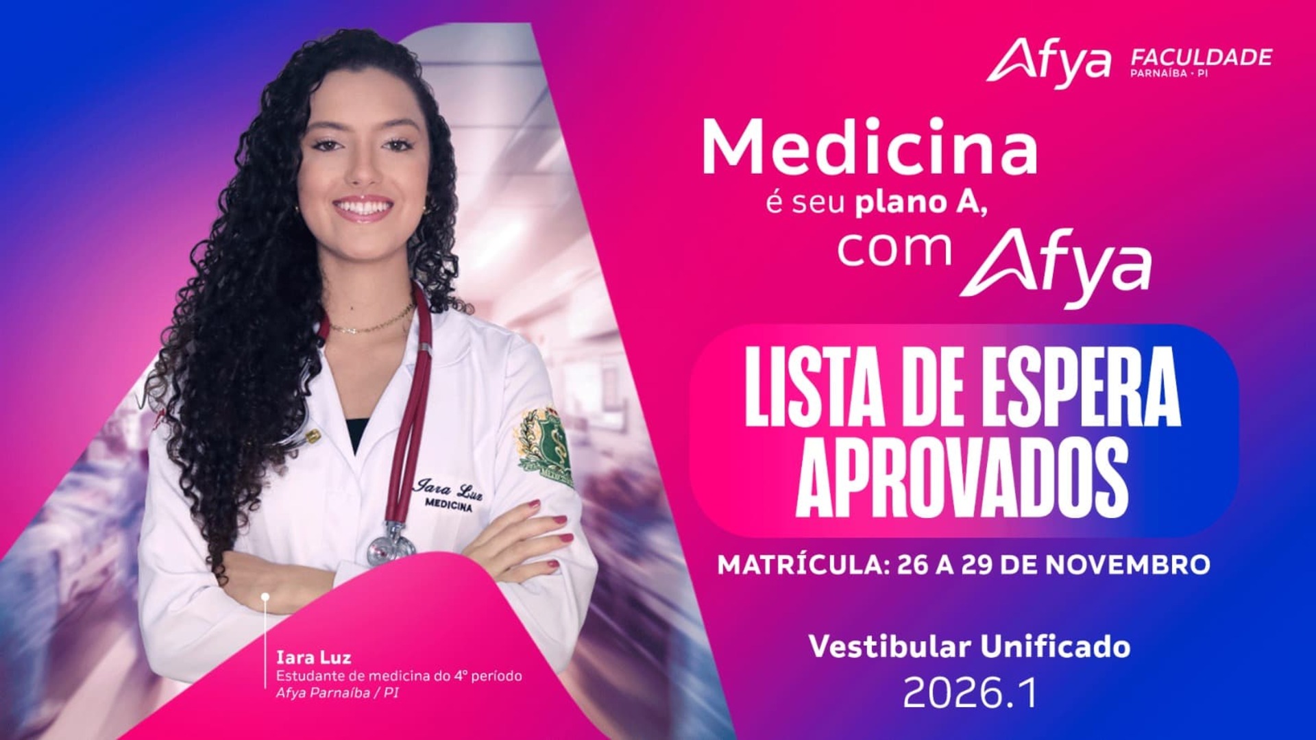 As Instituições de Ensino Superior participantes do Edital 01/2026, TORNAM PÚBLICA a relação de candidatos APROVADOS EM LISTA DE ESPERA no Processo Seletivo para o Curso de Medicina (Modalidade Vestibular Online) para o período letivo 2026/1, com período de efetivação de matrícula entre 26/11 à 29/11.