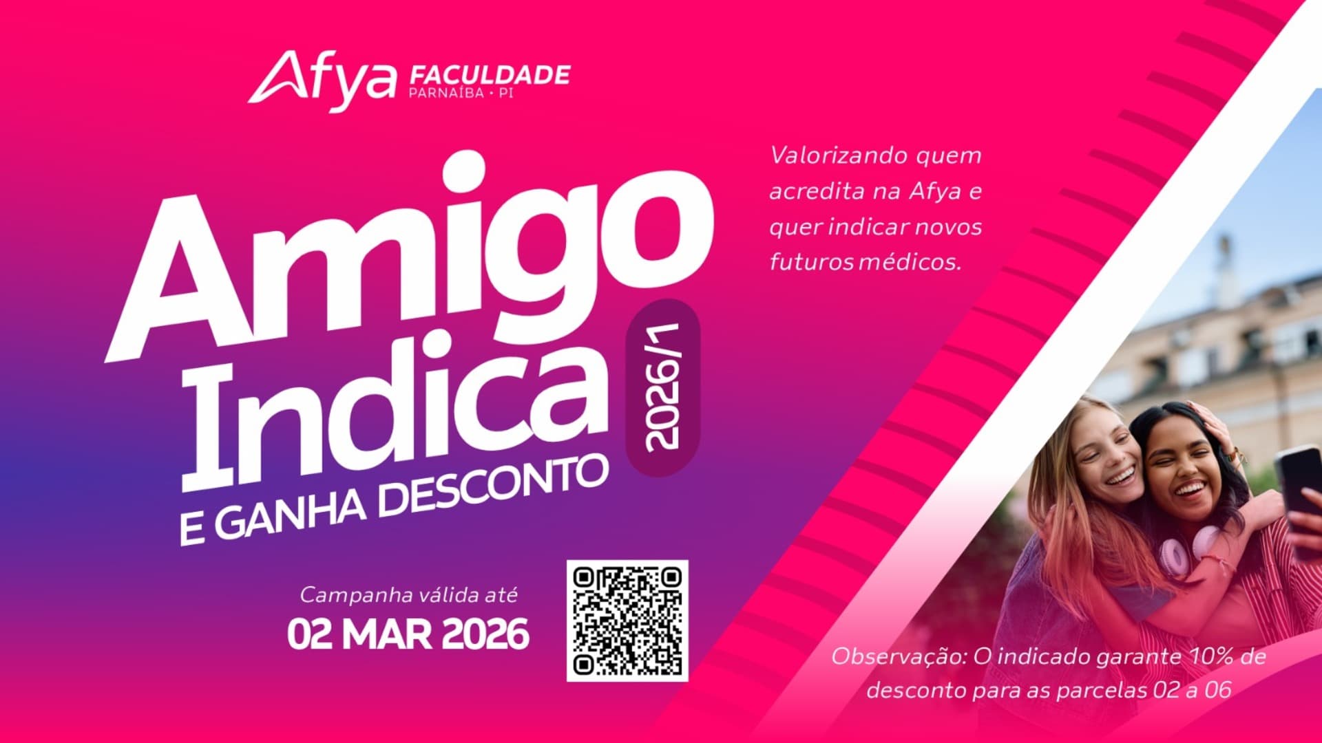A direção geral, da Afya Faculdade Parnaíba, publica regulamento de campanha Amigo Indica, para a concessão,funcionamento e validade dos descontos para o curso de Medicina oferecido pela instituição de ensino.