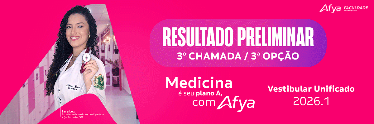 As Instituições de Ensino Superior participantes do Edital 01/2026, TORNAM PÚBLICA a relação de candidatos APROVADOS EM TERCEIRA CHAMADA REFERENTE A ESCOLHA DE 3ª OPÇÃO no Processo Seletivo para o Curso de Medicina (Modalidade Vestibular Online) para o período letivo 2026/1, com período de efetivação de matrícula entre 13/11 e 14/11.
