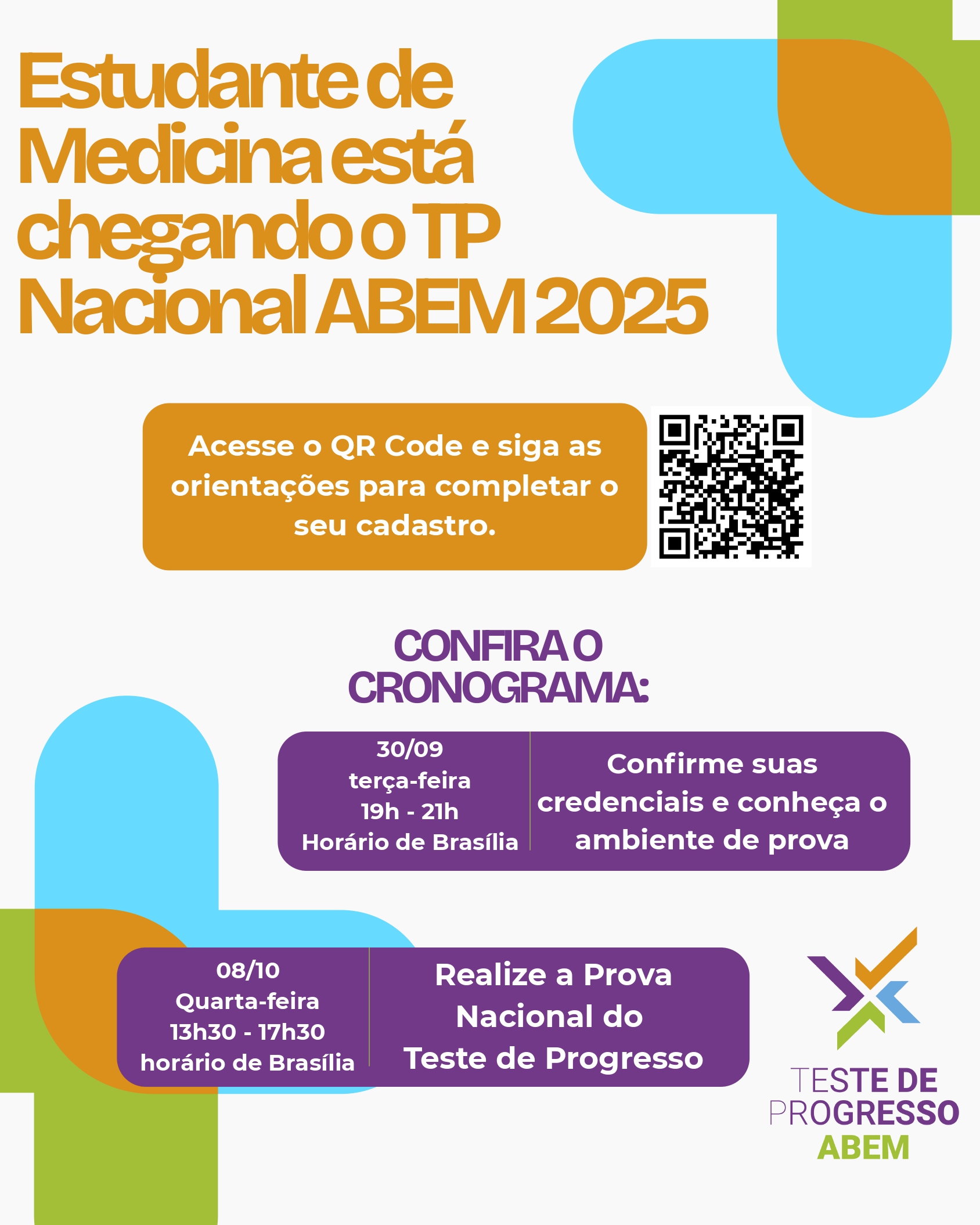 Prezados (as) alunos (as) do curso de Medicina, Gostaríamos de destacar a importância do Teste de Progresso Nacional da ABEM (Associação Brasileira de Educação Médica), que será realizado no dia 08 de outubro. Este teste é fundamental para avaliar o conhecimento adquirido ao longo do curso e é uma excelente preparação para a formação médica. Além disso, a pontuação obtida no teste pode ser um diferencial importante na seleção para programas de residência.