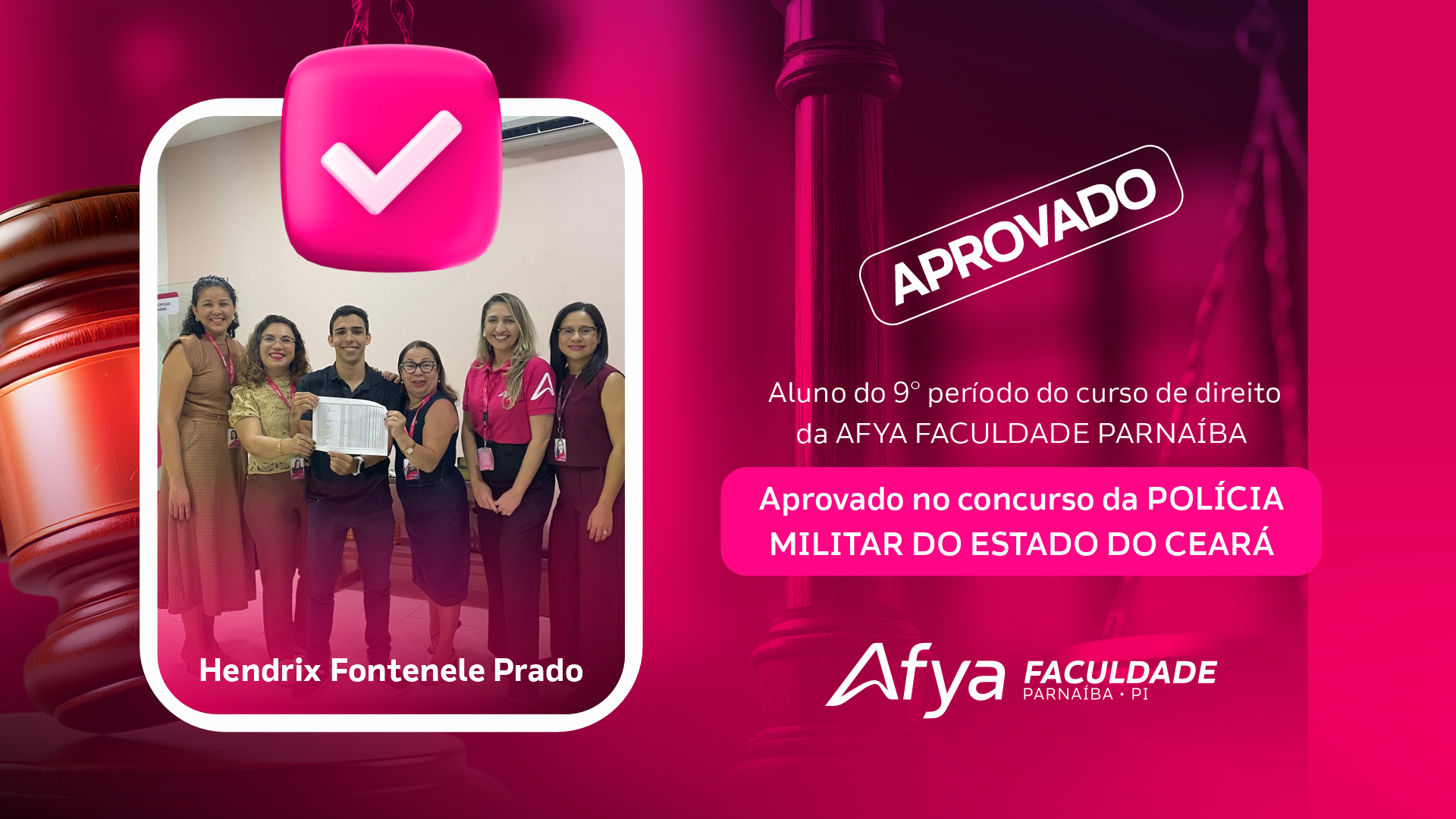 Hendrix Fontenele Prado, aluno do 9° período do curso de direito da AFYA FACULDADE PARNAÍBA. Aprovado no concurso da POLÍCIA MILITAR DO ESTADO DO CEARÁ.
